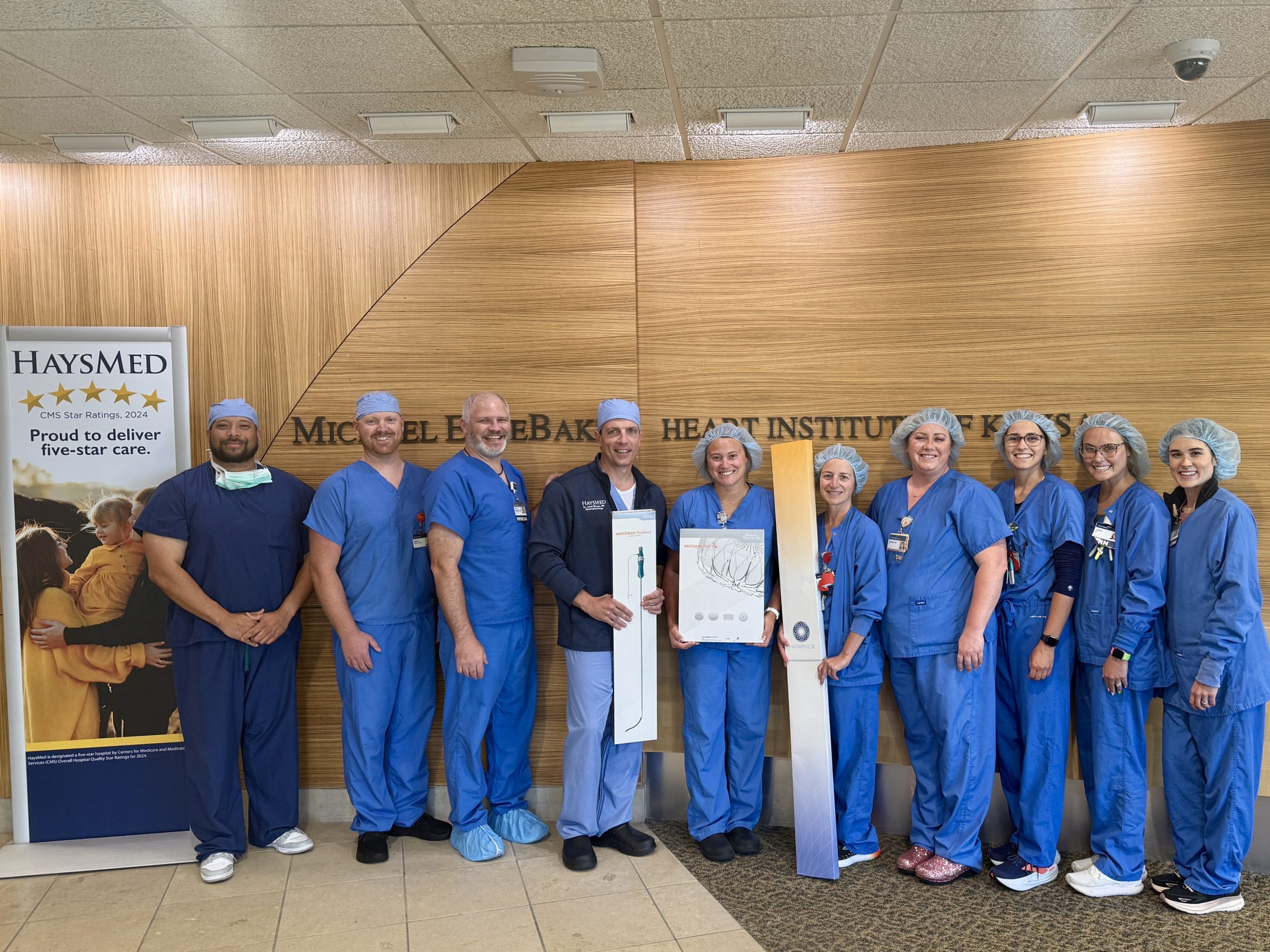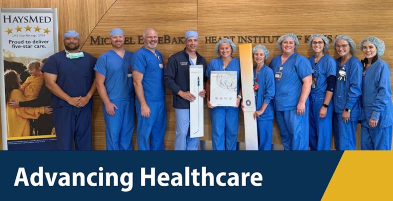 Featured in the HaysMed photo front row left to right: Kali Debey, Ashley Jacobs, Bobby Matter, Andrea Legleiter, Nikki Dixon, Heidi Gohl, Kelly Cole. Back row left to right: Chad Pritchett, Kaylyn Bustillos, Janine Kisner, and Steve Schulze.