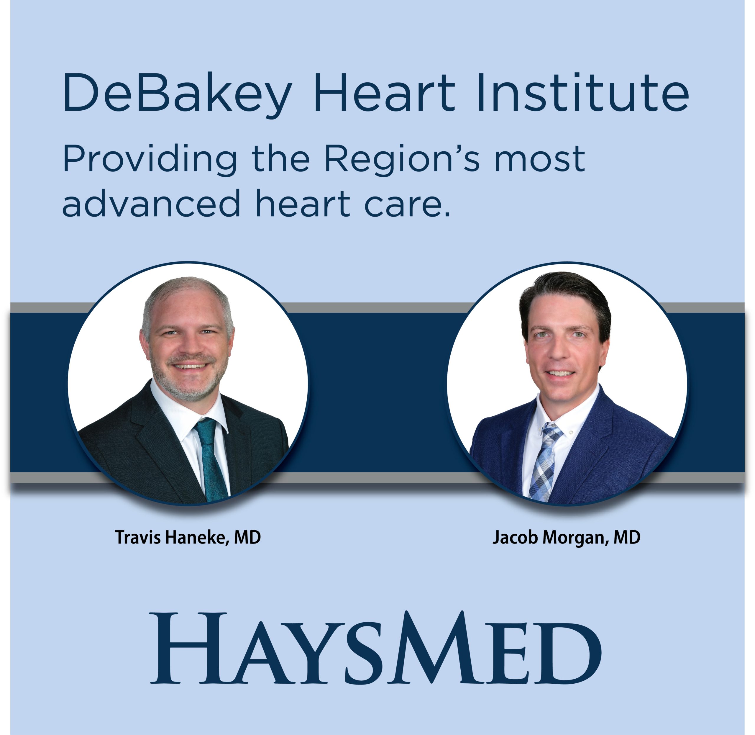 HaysMed is pleased to announce the addition of two highly skilled heart specialists to our Cardiology Department at the DeBakey Heart Institute. With Dr. Travis Haneke and Dr. Jacob Morgan, HaysMed continues our mission to offer the best possible care for our patients, ensuring access to advanced and specialized treatments right here in Western Kansas.
