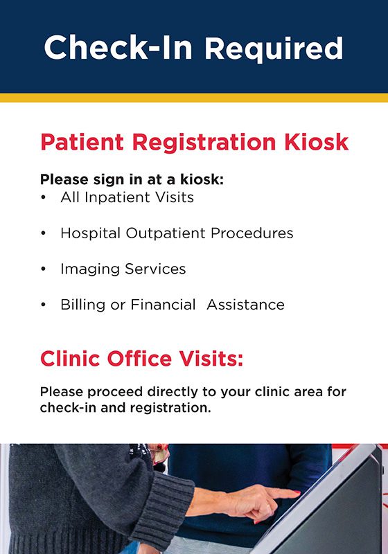 - Upon arrival, patients will sign in at a kiosk by entering their name, phone number, and whether they need an interpreter.